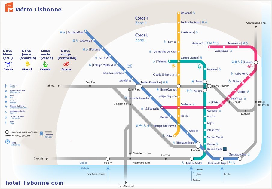 Le métro de Lisbonne, inauguré en 1959, comprend 4 lignes : linha Azul "Gaivota" (ligne bleue "Mouette"), linha Amerela "Girassol" (ligne jaune "Tournesol"), linha Verde "Caravela" (ligne verte "caravelle") et linha Vermelha "Oriente" (ligne rouge "Orient"). Ces lignes sont réparties sur deux zones : Coroal L (Zone L) englobant le centre de Lisbonne et ses points touristiques, et Coroal 1 (Zone 1) en périphérie de la capitale.